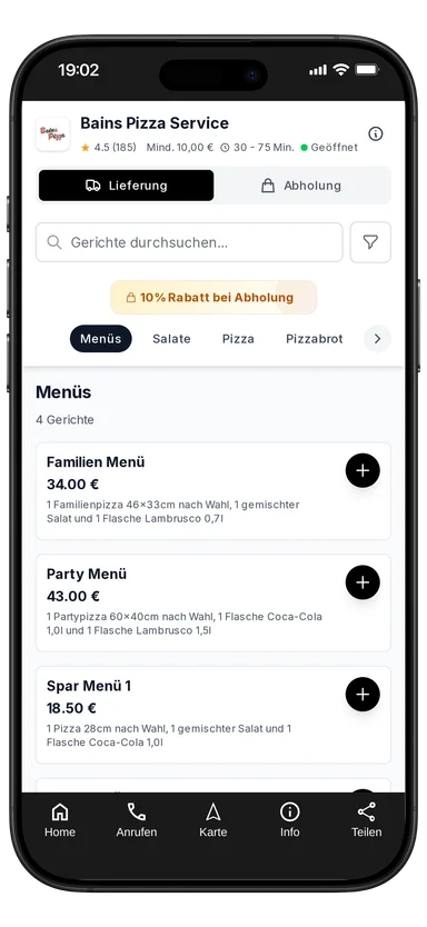 1 Familienpizza 46x33cm nach Wahl, 1 gemischter Salat und 1 Flasche Lambrusco 0,7l
